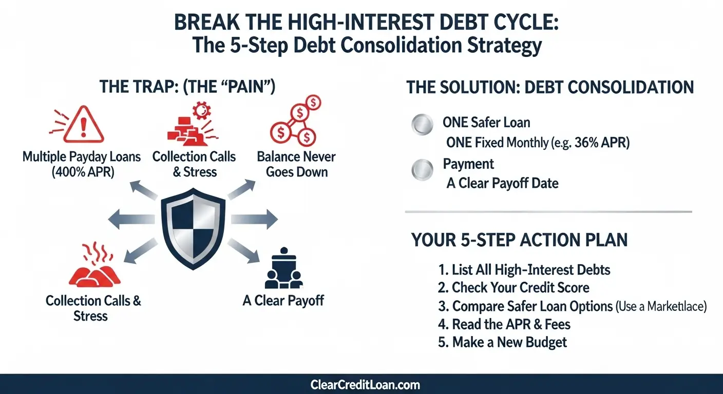 ClearCreditLoan can help. Use our free, secure tool to compare pre-vetted loan partners that specialize in debt consolidation for high-interest loans. See your options without impacting your credit score.